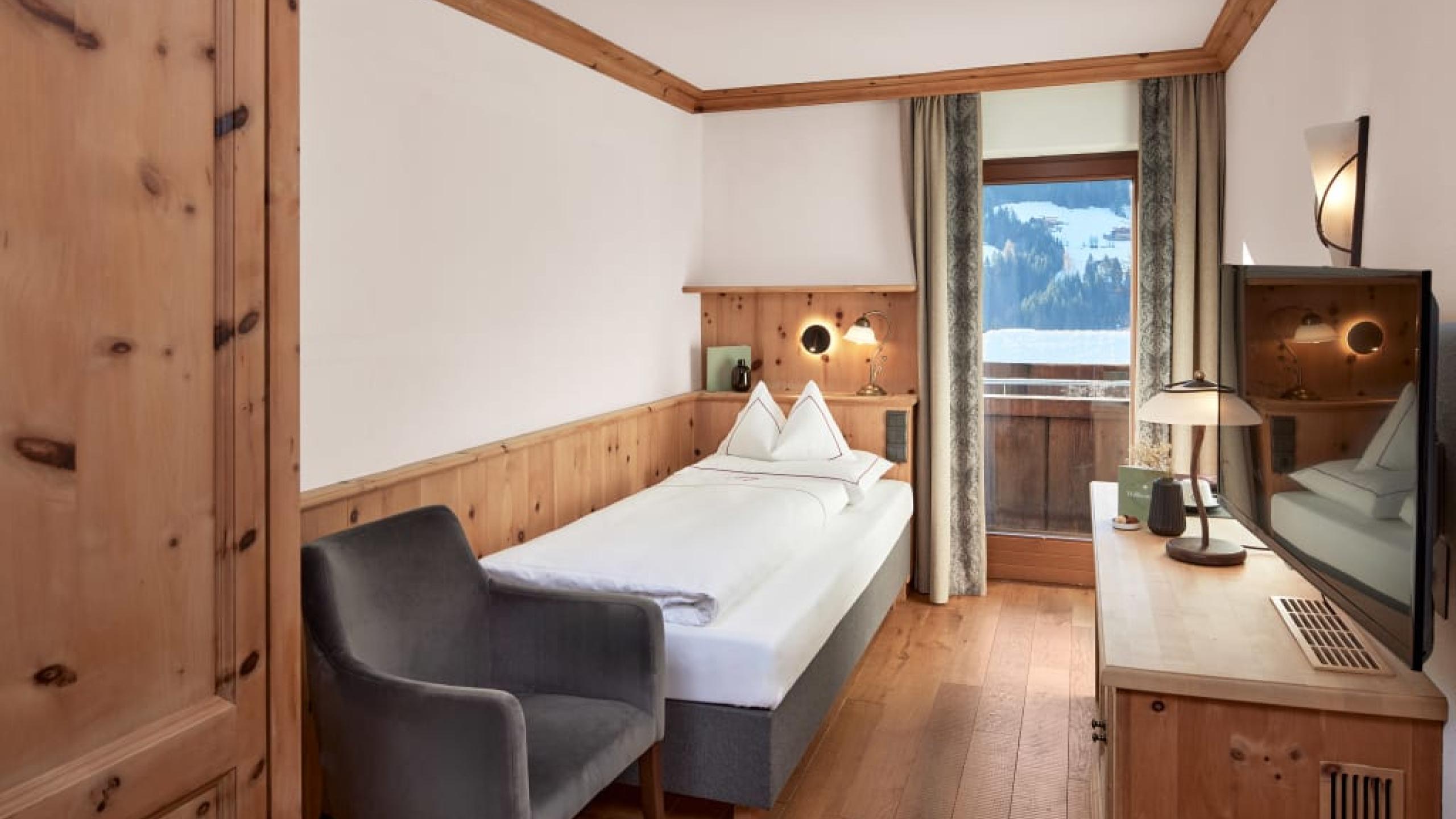 Gemütliches Einbettzimmer mit bequemen Einzelbett, 'Kissen-Schlafmenü', Schreib-/Arbeitstisch, Radio, Safe, Flat TV, Körperwaage, Espressomaschine und Tee-Ecke, Balkon oder Terrasse, Badezimmer mit Badewanne oder Dusche und WC, straßenseitig