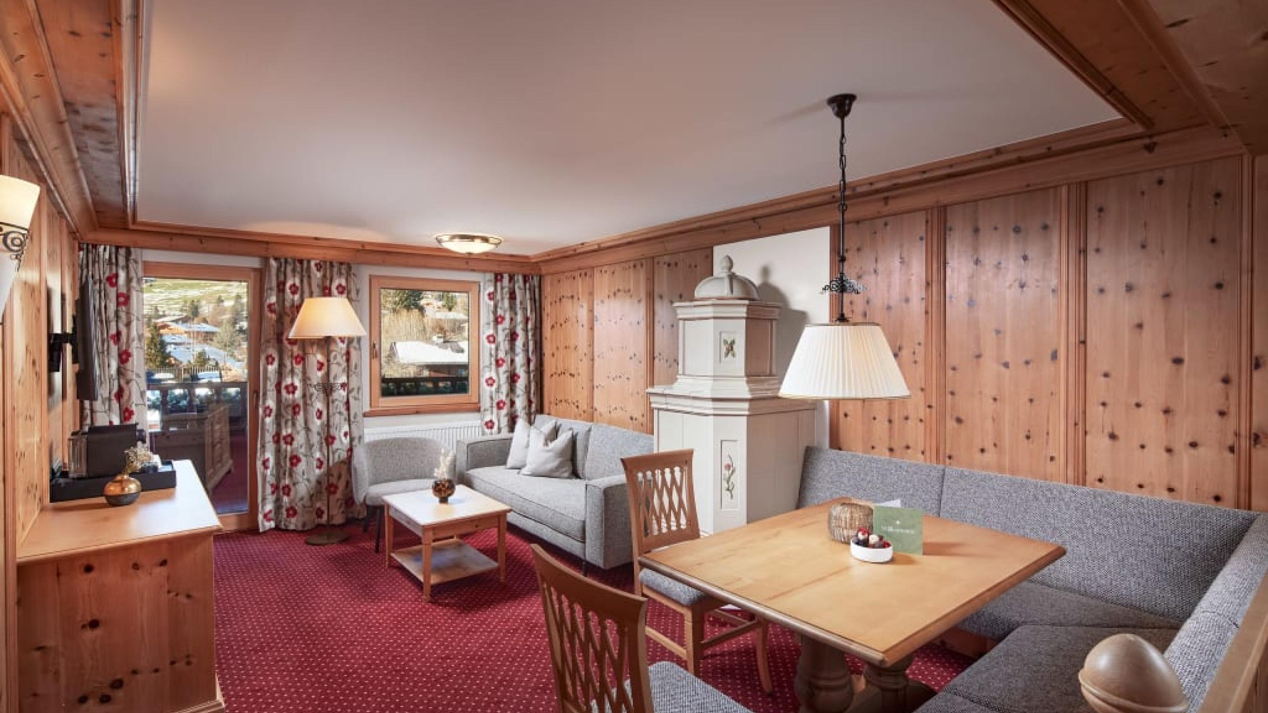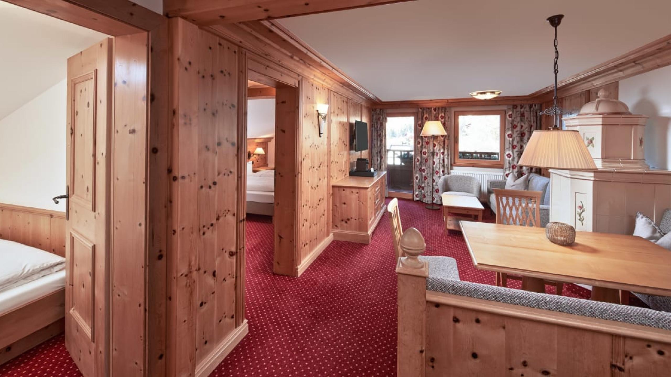 Großzügige und schöne Suite mit zwei separaten Schlafräumen sowie getrenntem Wohnbereich, Hauptschlafzimmer mit komfortablem Doppelbett, ’Kissen-Schlafmenü’, weiteres Schlafzimmer mit zwei bis drei Betten, gemeinsamer Wohnraum mit bequemer Relaxecke, Schreib-/Arbeitstisch, Kachelofen (teilweise), Radio, Safe, Flat TV, Körperwaage, Espressomaschine und Tee-Ecke, Balkon mit herrlicher Aussicht, Badezimmer mit Badewanne und Dusche (teilweise) sowie separatem WC (teilweise)